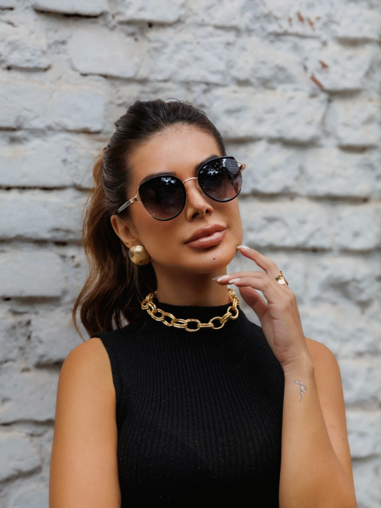 A modelo está utilizando o modelo Óculos de Sol Gatinho Arredondado Geovana – Preto – Metal/Acetato