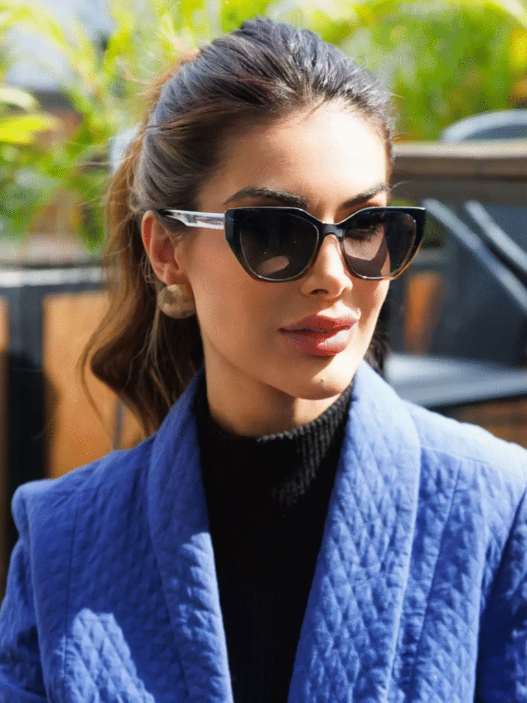 A modelo está usando o modelo Óculos de Sol Gatinho Blogueira Nora